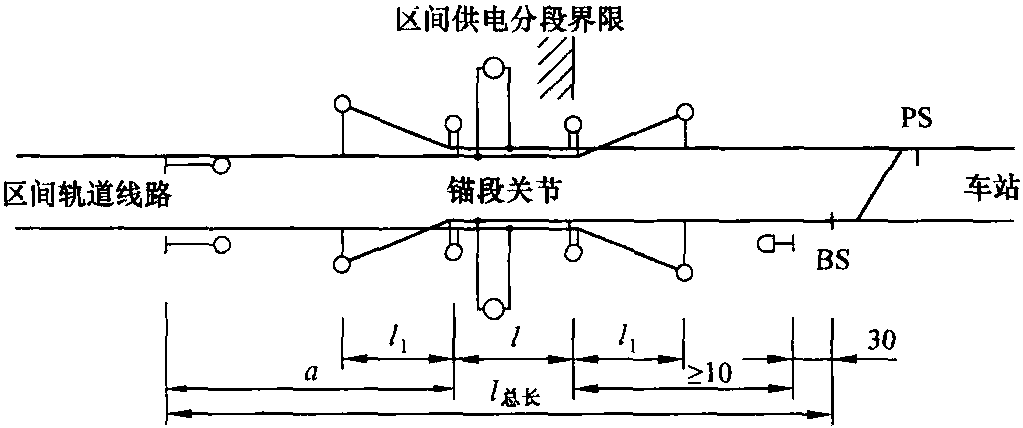 第10.5節中描述的車站與區間供電分段要求接觸網系統的線路有電氣分界。此處設計的絕緣錨段關節需要信號保護,即: 升起受電弓的牽引車輛在預告停止的信號機前后停靠時,不應該停在進站信號機與進站道岔間的絕緣錨段關節跨距內。圖6.17中的距離a界定了錨段關節轉換跨距相對于信號機的位置并表現為信號機與跨距內第一個轉換柱之間的距離。
