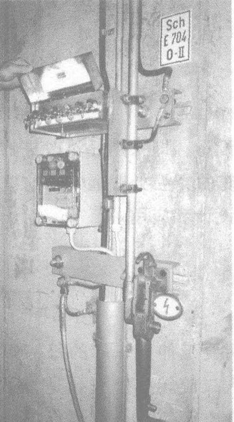 車庫股道隔離開關用來將該股道的接觸網及維修設備斷電并接地。它們都設有接地點。隔離開關在斷開狀態下被鎖定。用來打開工作平臺入口的鑰匙只有在隔離開關處于斷開并接地的條件下才能拔出。在裝配工作占用的股道數超過兩股道時,則可用一個車庫外部的總開關來分斷所有股道的接觸網。圖8.2所示為德國鐵路慕尼黑的一個典型車庫的總開關裝置。