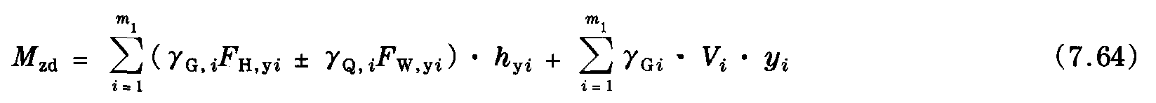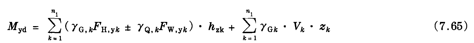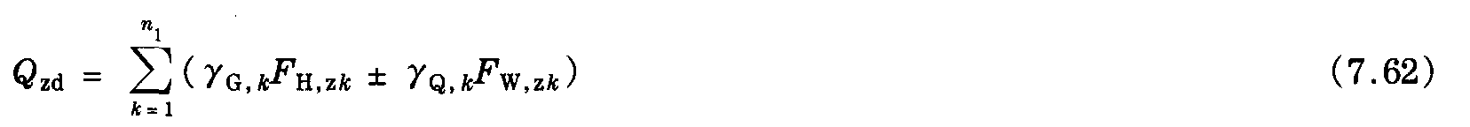 根據圖7.15,可以計算基礎頂部的力矩和橫向力。與線路垂直的荷載產生力矩My和橫向力Qz,而與線路平行的荷載產生力矩Mz和力Qy。力Qx表示垂直荷載之和。力矩Mx代表支柱軸上的扭矩,它可能是由與支柱軸有關的荷載的不對稱作用而致,在基礎的頂部,垂直力將是