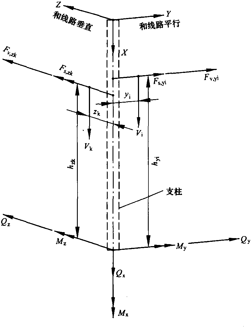 根據式(5.10)、式 (5.14) 和式(5.17),力FHk是由接觸懸掛和牽引供電線路(附加線)產生的。力FW,zk是風荷載,可由用于接觸懸掛的式 (5.27)求出。它們可能從兩個方向交替作用。