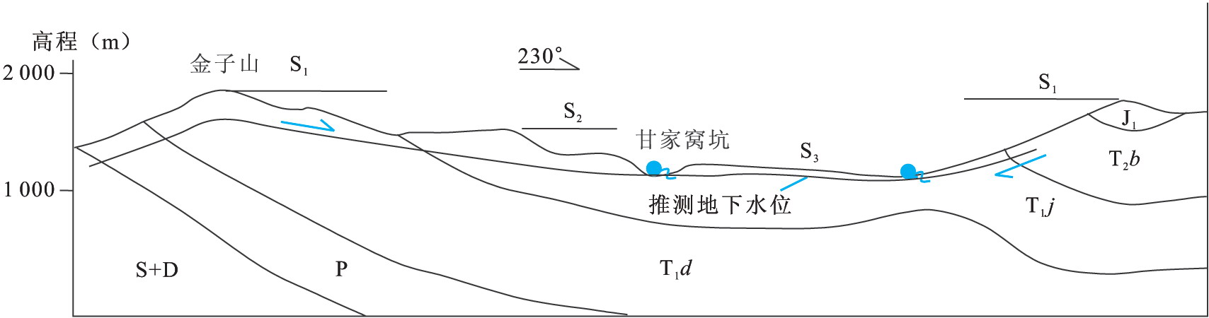 區(qū)內(nèi)構(gòu)造有云霧山背斜、金子山復(fù)背斜,后者構(gòu)造區(qū)域更為控制線路的選擇。金子山復(fù)向斜(含次級寬緩向斜)的南、北兩端翹起收斂,與山勢圍合一致。金子山復(fù)向斜核部分布巴東群非碳酸鹽巖與不純碳酸鹽巖,構(gòu)成金子山山地(正地形);向斜的東南翼組成復(fù)式次級向斜,分布嘉陵江組(T1j)、大冶組(T1d)純碳酸鹽巖巖組間夾泥灰?guī)r等不純碳酸鹽巖,依次組成較寬闊的次級向斜槽谷低地、石板嶺單面山;橫斷面反映的構(gòu)造、剝夷面關(guān)系如圖4-16、圖4-17所示。