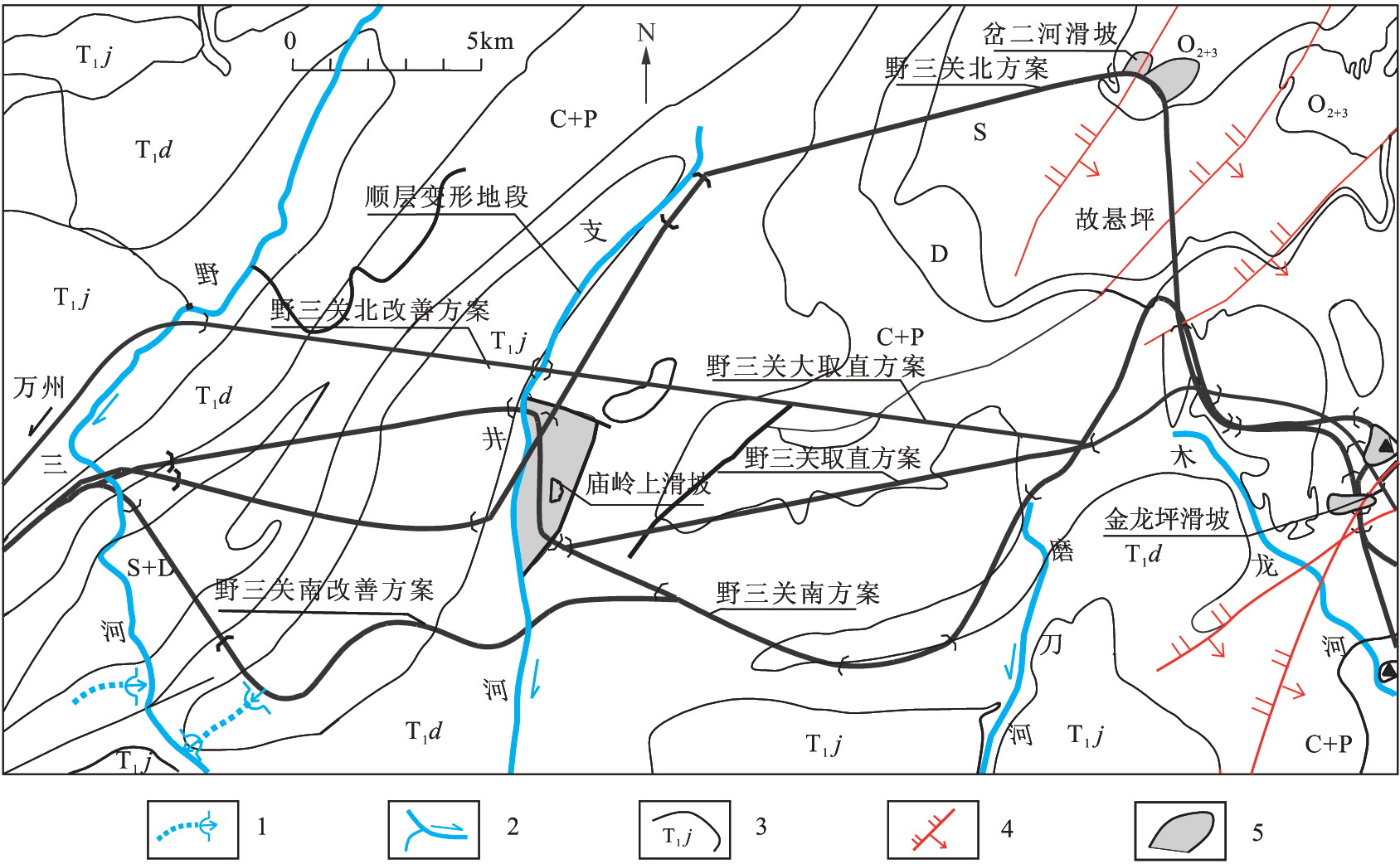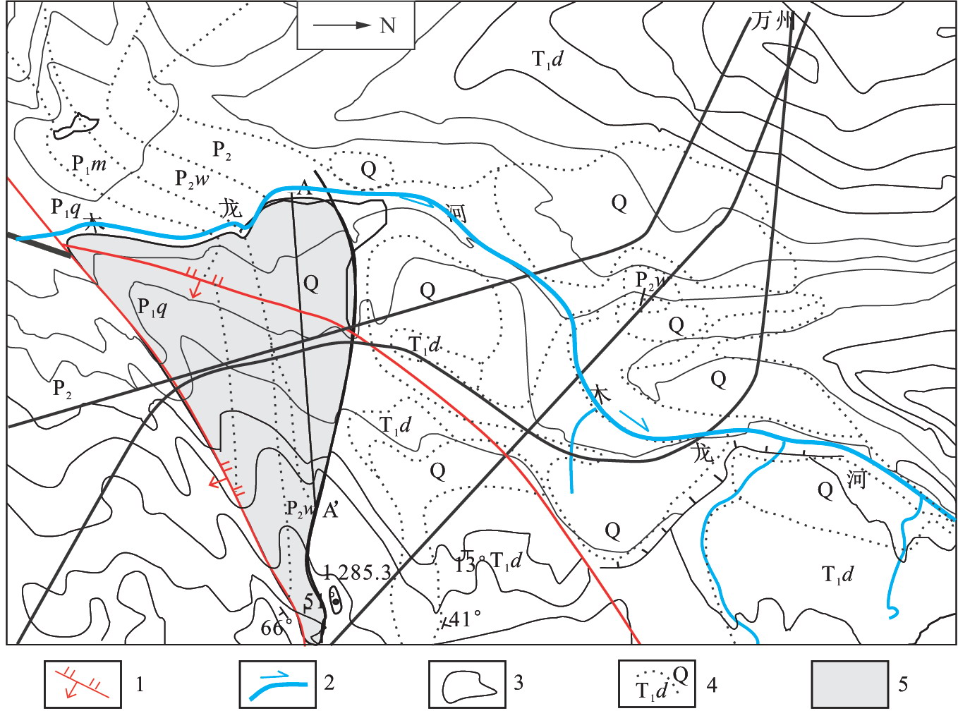 1.斷層;2.河流;3.等高線;4.地層界線;5.滑動(dòng)體