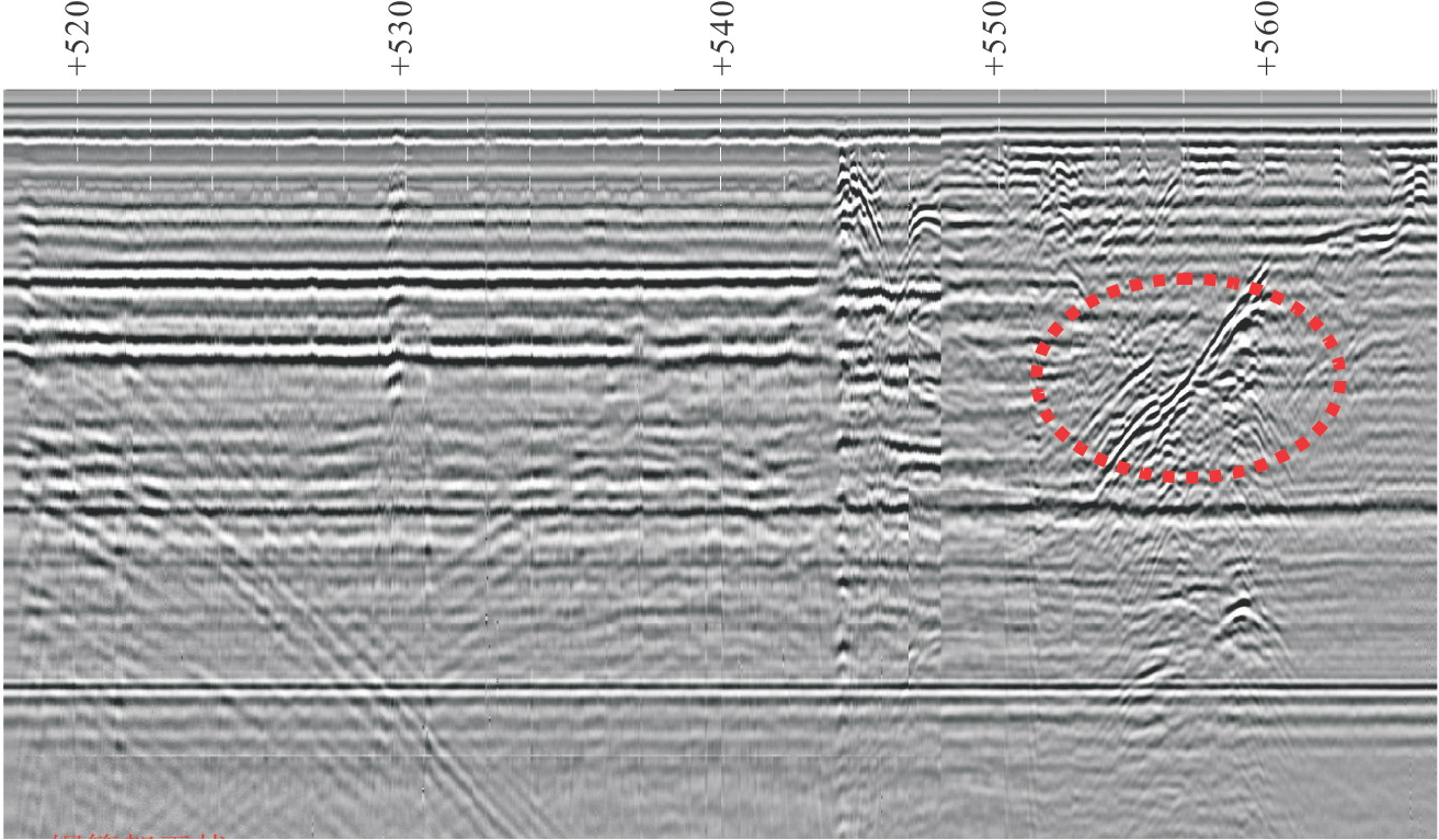 隧底溶蝕裂隙發育與巖溶發育兩種情況在二者規模都不大的情況下,有時是難以準確區分的,圖5-35為高橋壩隧道DK227+520~+571段雷達剖面圖,從圖中可看出+550附近雷達異常明顯,經鉆探驗證該處僅為溶蝕裂隙發育。