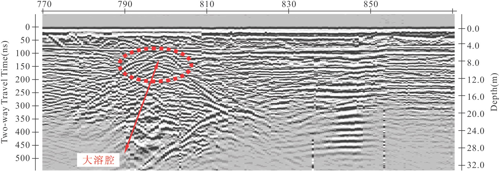 從雷達圖像分析看出,溶洞雷達圖像特點是被溶洞側壁、頂板的強反射所包圍的弱反射空間,溶洞底界面的反射則不太明顯,當溶洞為空洞(或充水)時,洞體內雷達波幾乎是沒有反射的直達溶洞的底界面;當溶洞充填沉積物時,其溶洞內的充填物根據物性差異的不同,也會產生不同的雷達波形式,大多數情況下其充填物為塊石夾粘土等不均勻體時,也會導致穿過其中的雷達波形雜亂無章,若粘土或細密型碎顆粒狀物含量較大,也可見一組較短周期的細密的弱反射,甚或導致雷達波損失殆盡,這也是判定充填型空洞存在的主要標志之一。