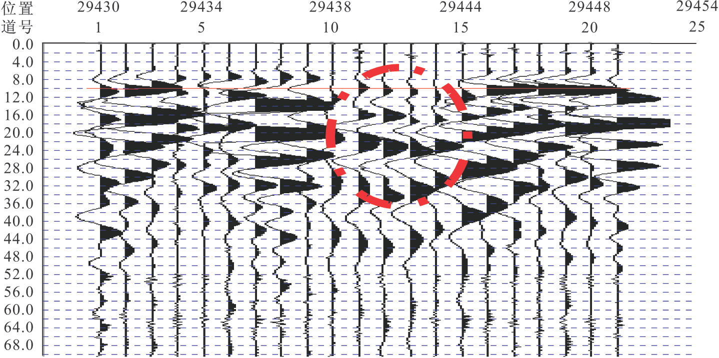 圖5-21為彭加坡隧道Ⅰ線DK29+430~+450右線單點反射地震記錄,從記錄中可看出DK29+439~+443段波形特征較之兩側(cè)呈明顯異常 變化,表現(xiàn)形式為首波及面波同相軸均向下凹陷,波長變大。該異常經(jīng)鉆探(+440處右線)驗證:“3.0~4.0m、7.20~10.30m為溶洞,無充填,11.00~11.30m、12.60~17.70m為溶洞,無充填!笨梢娫摦惓P螒B(tài)反映了典型串珠狀巖溶異常波形特征,即整體波形同相軸向下凹陷,較之兩側(cè)波長有較大的拉長現(xiàn)象,整體如“胡須狀”。