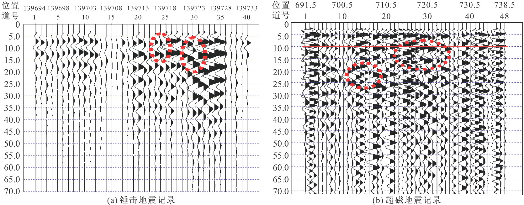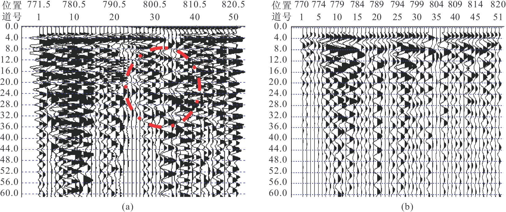 圖5-20DK238+770~+820超磁震源(a)與錘擊震源(b)溶洞處理后地震記錄對比圖