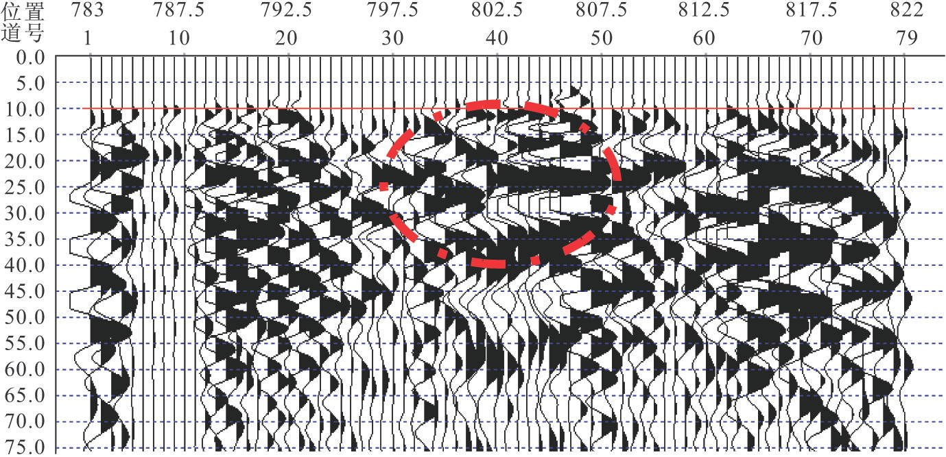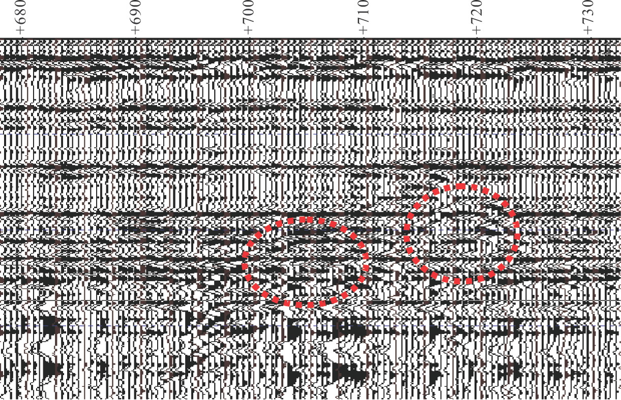 從圖5-22(b)可看出,在DK139+705附近,17ms深度下還發(fā)育一溶洞異常(圖中第一個紅圈所示),這與地質(zhì)雷達探測結(jié)果(第一個雷達繞射波異常,圖5-23)發(fā)育位置及深度均吻合很好,但是這一異常特征在圖5-22(a)圖中卻很難看出,表明埋深稍大的巖溶異常,超磁震源激發(fā)得到的地震反射波這一“優(yōu)勢頻率”比普通錘擊震源得到的地震記錄要明顯得多。