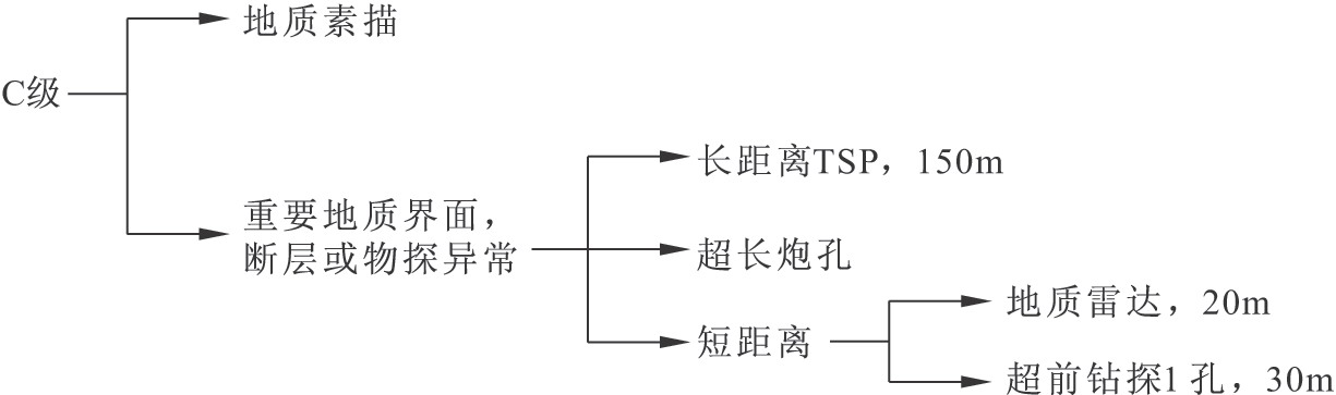 C級地段施工地質超前探測方法組合為地質素描,在重要地質界面、斷層或物探異常處布置長距離TSP203超前探測、短距離超長炮孔,如必要時再布置短距離地質雷達、短距離超前鉆孔1孔。C 級地段超前探測方法的組合模式如圖6-40所示。