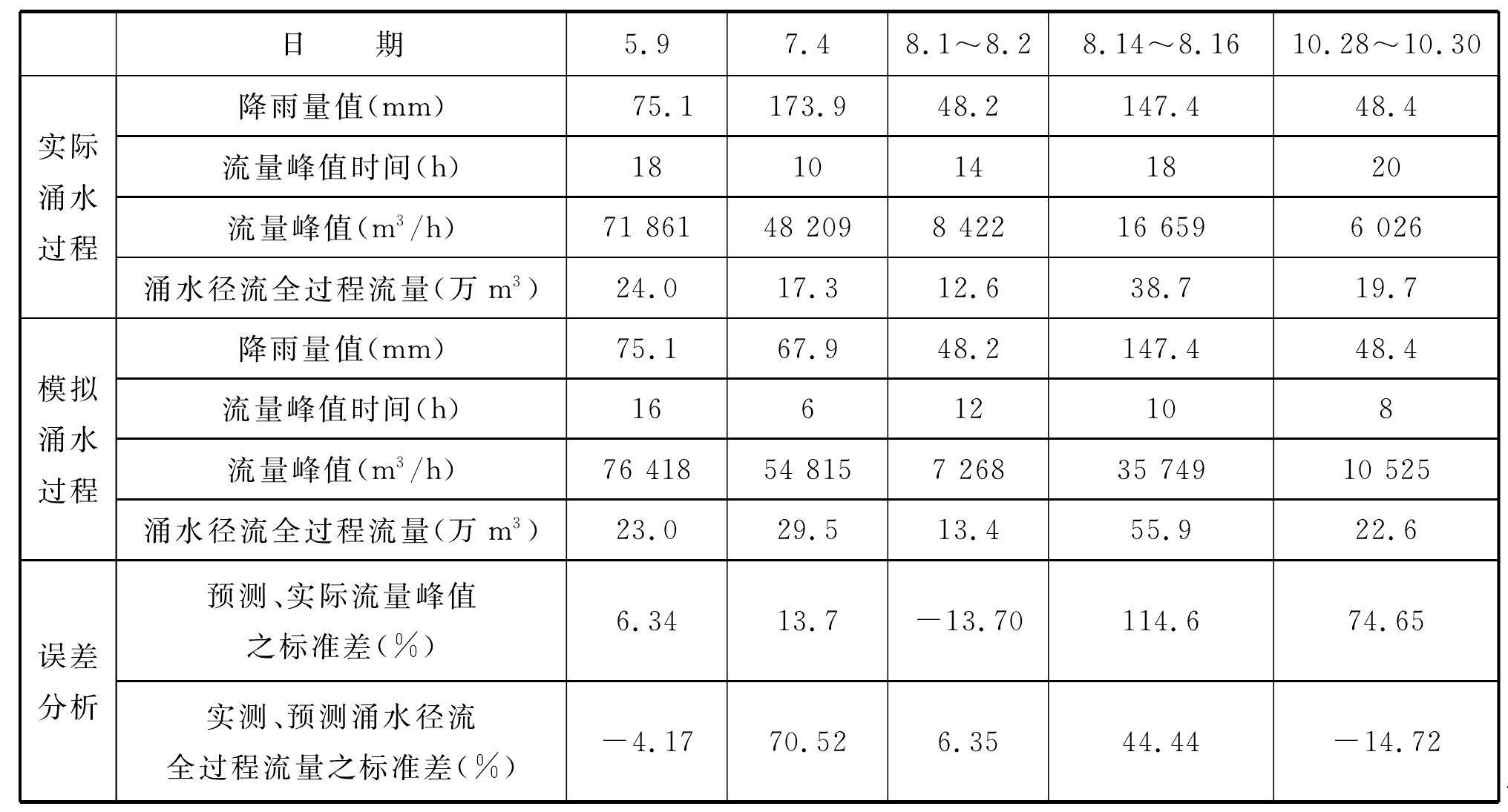 5次降雨的計算結果如表7-8所示。5次降雨時的流量預測、實測值標準差絕對值為6.34%~75.65%,個別達到114.6%,平均為44.60%;模擬、實際涌水徑流全過程流量標準誤差絕對值為4.17%~70.52%,平均為28.04%。由此看出,通過流域水文模型計算的隧道涌水量結果是比較符合實際情況的,雖然計算洪峰的出現時間比實際提前,但對于隧道安全施工是有保障的。因此,對于像馬鹿箐隧道這種地表巖溶典型、地下巖溶管道都極其發育的地區,在正確認識巖溶隧道區水文地質條件、選取合適的流域參數、建立符合巖溶流域匯流特點的單位線的基礎上,使用流域水文模型來預測典型巖溶隧道的涌水量及其地下徑流水文過程是可行的。