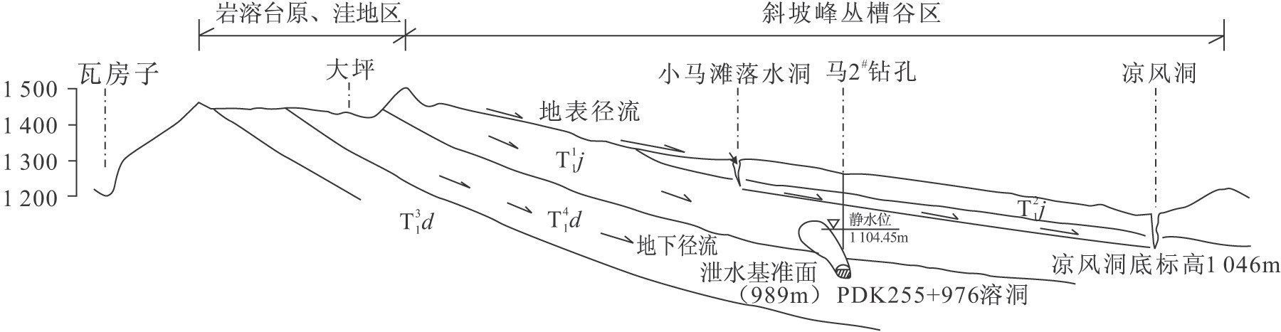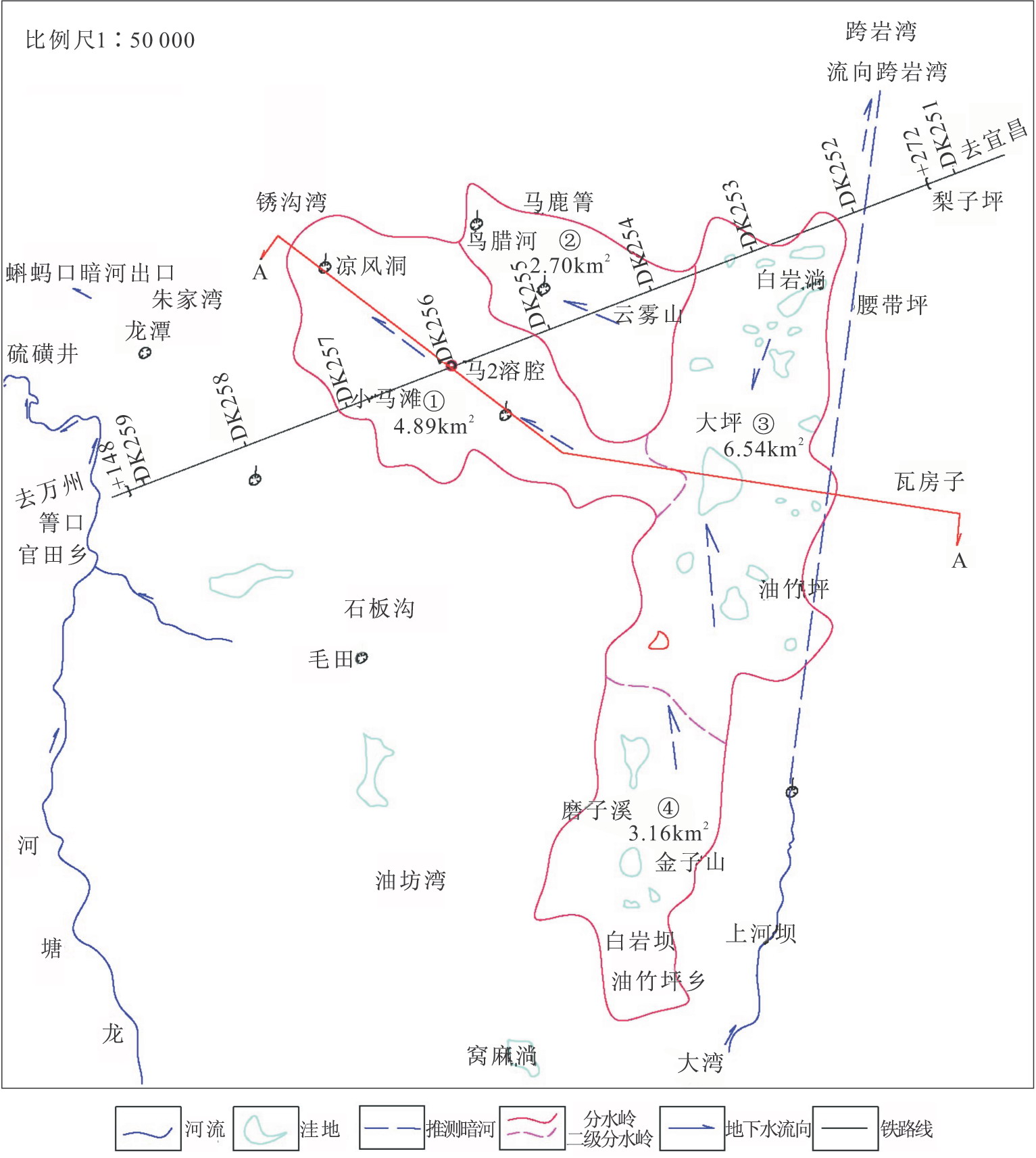 PDK255+978溶腔巖溶水系統隸屬于小溪河地下河系統上游箐口子系統的分支——小馬灘地下河系統,小馬灘地下河系統上游油竹坪巖溶臺原、洼地區為補給區,集水面積(油竹坪巖溶臺原、洼地補給區及小馬灘峰叢槽谷補給徑流區)共計14.59 km2,其中巖溶水補給徑流區(小馬灘峰叢溝谷區)面積4.89km2。馬鹿箐隧道PDK255+978溶腔集水面積如圖7-3所示,A—A水文地質剖面示意圖如圖7-4所示。