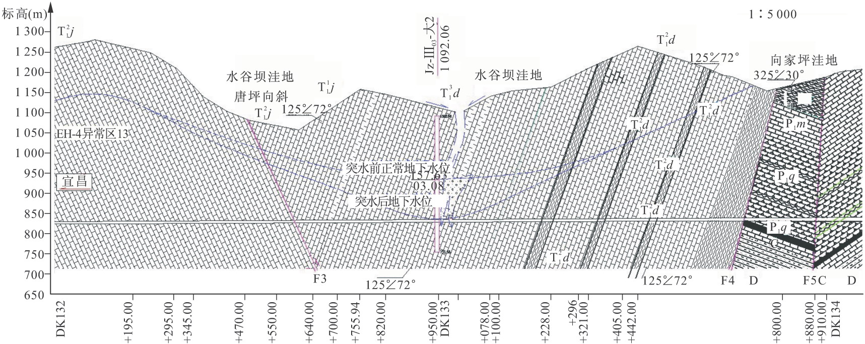 PDK132+990巖溶段發(fā)育地層為三疊系嘉陵江組下部和大冶組上部灰?guī)r,地表為水谷壩洼地,向斜構(gòu)造,其間發(fā)育有F3斷層。由于大冶組底部為泥巖和頁巖地層,為相對阻水層,有利于處于該阻水層上部的灰?guī)r地層巖溶和地下水發(fā)育。地下水流向由北東流向南西,排泄于野三河下游。地下水主要受大氣降水補(bǔ)給,地表深孔測得的地下水位埋深160m左右(標(biāo)高943m),洼地匯水面積6.06 km2,見大支坪隧道區(qū)地下水流向圖(圖7-1)和PDK132+990巖溶段水文地質(zhì)縱斷面圖(圖7-2)。