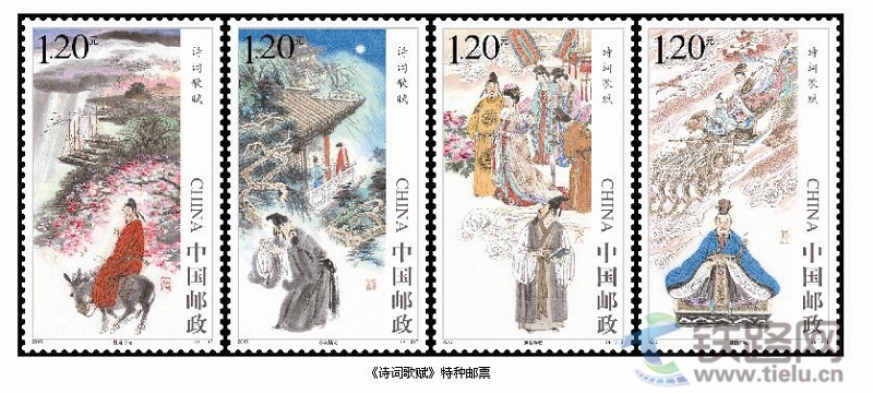 11月12日,中國郵政發行《詩詞歌賦》特種郵票,全套4枚。我國是詩詞歌賦的國度,歷代名家輩出,精品如林。4枚郵票內容表現的是我國古代詩詞歌賦四種體裁的代表作者及其代表作品,圖案分別為“杜甫吟詩”“東坡填詞”“居易醉歌”和“曹植作賦”。郵票由我國著名畫家馮遠先生創作設計。