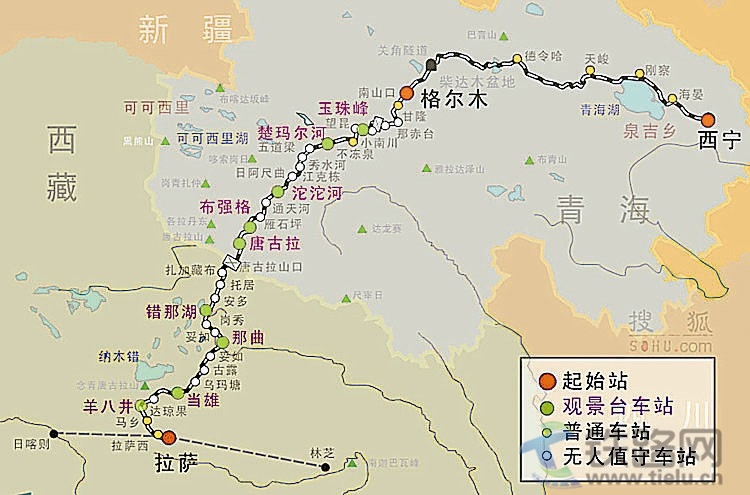 青藏鐵路全長1956公里,被譽為 “天路”。青藏鐵路實際上分兩期建成,一期工程東起青海西寧,西至格爾木,1958年分段開工建設,1984年5月建成通車;青藏鐵路二期,也就是大多數人所指的青藏鐵路,東起青海格爾木,西至西藏拉薩,全長1142公里,2001年6月29日開工,2006年7月1日全線通車,途經納赤臺、五道梁、沱沱河、雁石坪,翻越唐古拉山,再經安多、那曲、當雄、羊八井到拉薩。該段海拔4000米以上的路段為960公里,多年凍土地段為550公里。青藏鐵路是目前世界上海拔最高、凍土里程最長的高原鐵路。