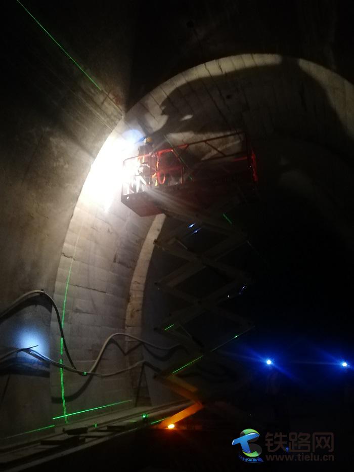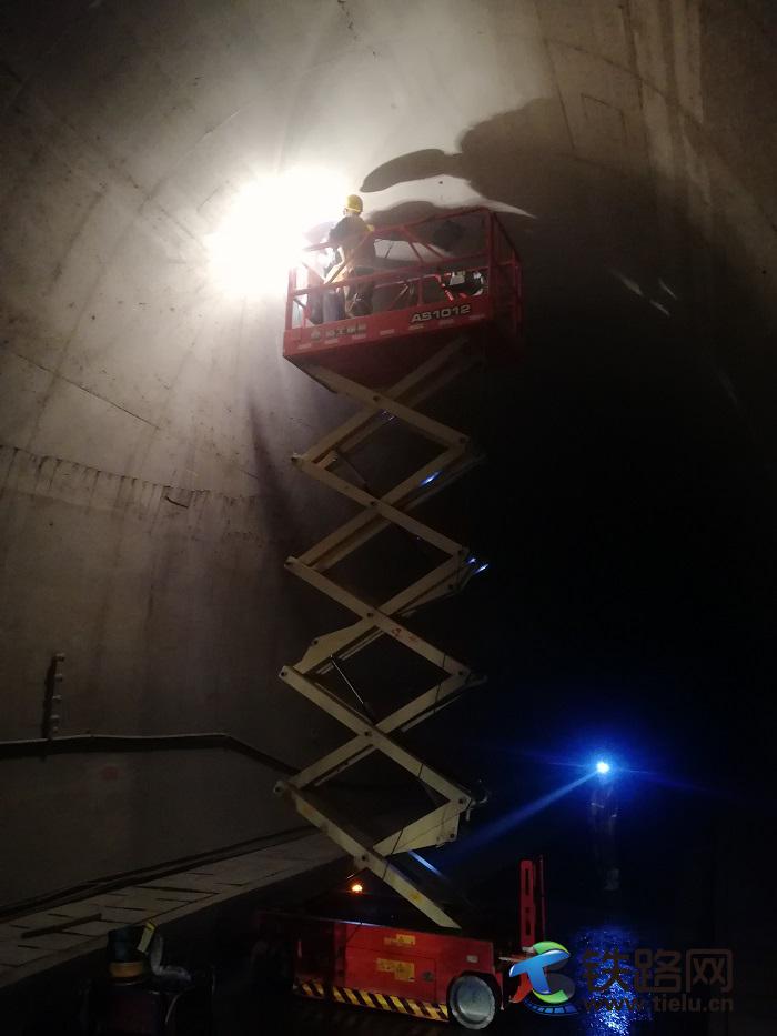 自10月中旬以來,這里就成了接觸網作業二隊的一景,每當夜幕降臨,站在隧道口就能看見里面閃爍的燈光,并傳來發電機的陣陣“嗡嗡”聲。放眼望去里面場面不大,只有四臺作業車在不停地升降、對位,每組就3、5個人,但這已經足以讓夢中的營盤山蕩氣回腸了。只聽升降作業車發出蜂鳴聲響,電錘從低速定孔到高速震動時的刺耳鳴叫,此起彼伏;作業人員嫻熟的操作技術,孔距標準,孔洞圓直排列有序,讓人嘆為觀止。他們沒有語言交流,只有定位模板緊跟一個手勢一個眼神移動,或者點頭表示認可,不管是吊柱位置、中錨孔、關節錨洞、附加懸掛點或是鉆頭的規格、孔徑、深度都掌握的非常精準,人人成竹在胸,電錘的每一次沖擊都能夠在速度和激情中一氣呵成,周而復始,這些電氣化的嬌子,每天仍然在營盤山隧道里重復一個故事。
