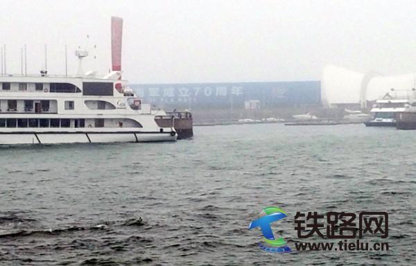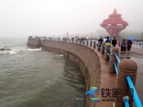 下午五時許,五四廣場游客絡繹不絕,冒著雨,撐著傘,獨自游,結伴游,團體游,緊緊繞著黃海堤岸,觀賞大海的力量。
