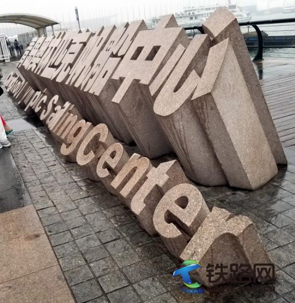 隨著鏡頭的推進,看到碩大標語牌——熱烈慶祝中國人民解放軍海軍建軍70周年,也看到了左右兩邊的國際會議中心和奧運五環等建筑。當走近青島奧帆中心門口時,風更大,雨更緊,沒帶雨具的我,只好轉身緊回。
