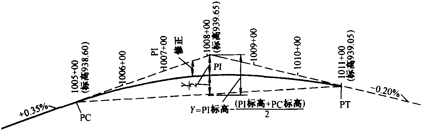 一般以這種方式確定的豎曲線的長度將不是一個偶數測點,使用下一個偶數測點的豎曲線是更簡單且符合要求的。也就是,如果計算的長度是7.2個測點,就使用8個測點的豎曲線。