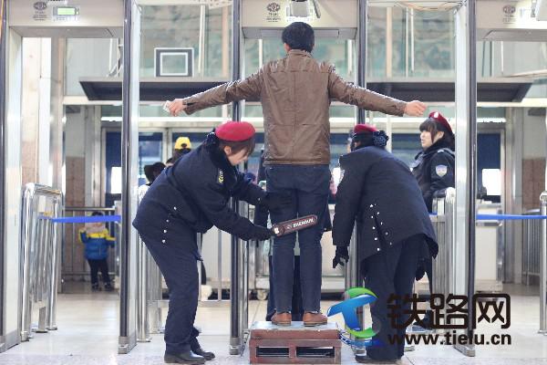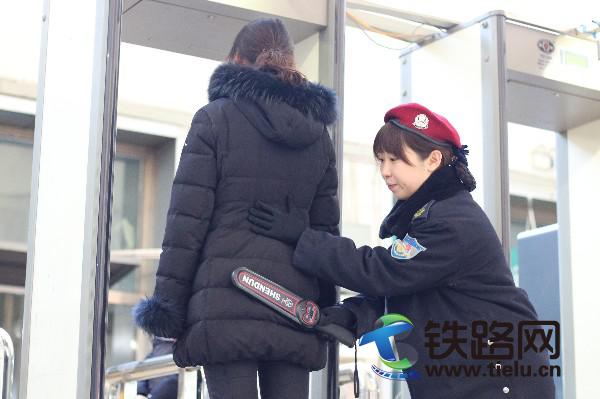 7. 2017年1月20日,內(nèi)蒙古包頭,安檢員李丹在包頭東火車安檢口引導(dǎo)旅客有序接受安檢。