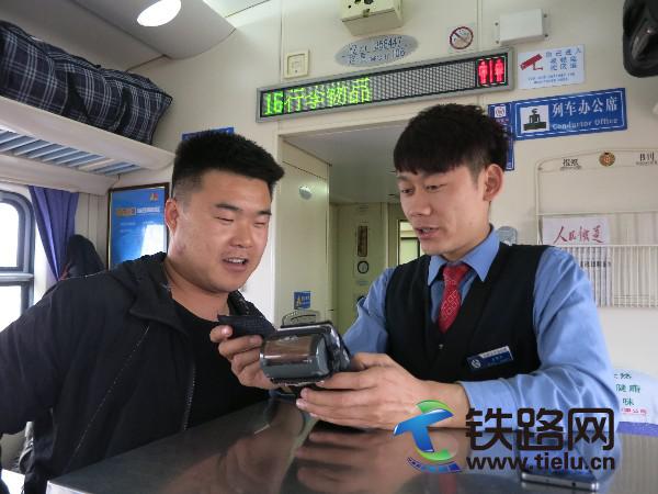 圖片2:業(yè)務(wù)員馬海濤在給旅客認(rèn)真核對(duì)車票信息。